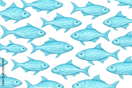Watercolor illustration depicting seamless light blue fish pattern with white stripes, perfect for marine-themed graphic projects