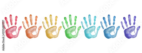 Watercolor illustration. Hand painted set of colorful human hand prints in rainbow colors. Palms of man and woman, girl and boy. Children handprints. Isolated clip art. People body part