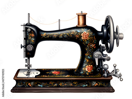 Watercolor illustration of a black manual sewing machine with flower design, isolated on white background