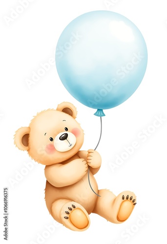 Watercolor illustration of a cute teddy bear holding a blue balloon floating in the air, perfect for baby shower invitations, greeting cards, and children's book illustrations