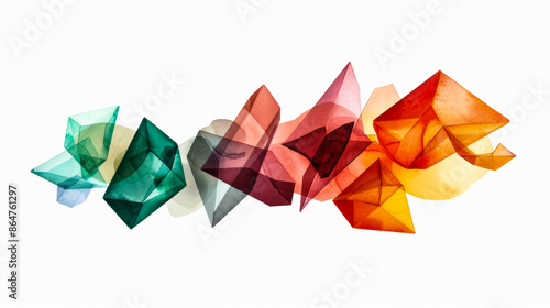 Watercolor illustration of a fragmented prism design with dazzling emeralds and rich maroons, bright simple watercolour background