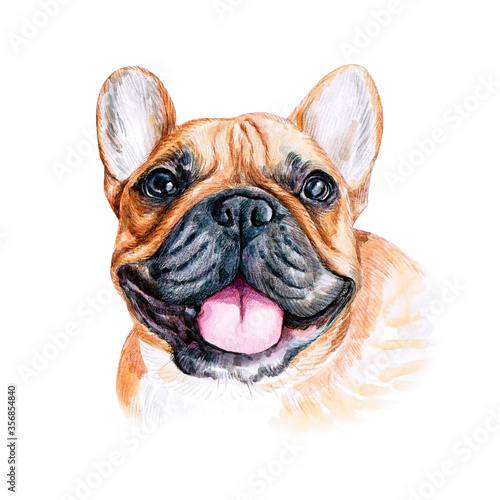 Watercolor illustration of a funny dog. Hand made character. Portrait cute dog isolated on white background. Watercolor hand-drawn illustration. Popular breed dog. French Bulldog