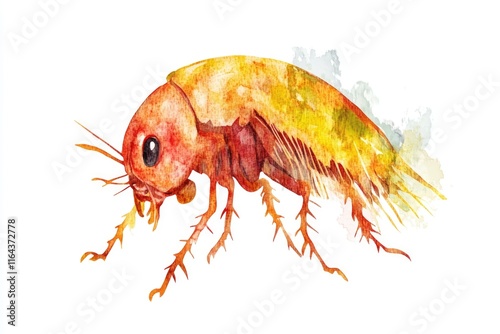 Watercolor illustration of a tiny flea bug in a whimsical style