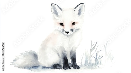 Watercolor illustration of a white fox sitting against white background