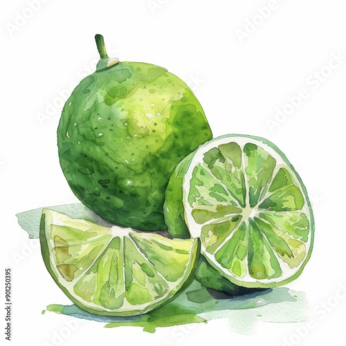Watercolor illustration of a whole lime and some lime slices isolated on white background. Colorful sketch. AI generative