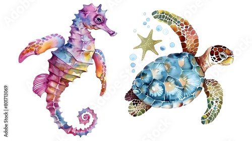 Watercolor Illustration of Seahorse and Turtle Emphasizing Marine Tranquility