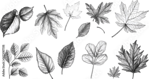 Watercolor Leaves Border Black and White Botanical Illustration Seamless Pattern