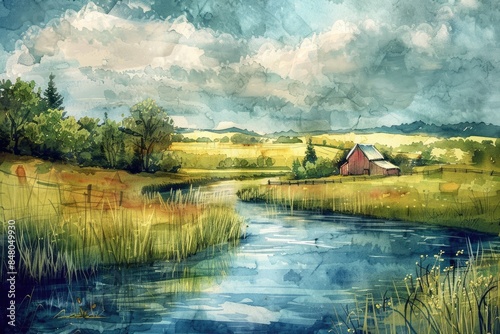 Watercolor Nature Landscape with River and Empty Table. Countryside Farming Illustration
