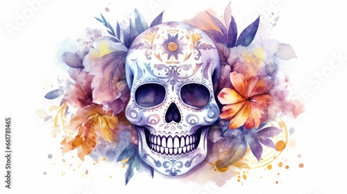 Watercolor painting in shades of white of a sugar skull or Mexican catrina. Day of the Dead