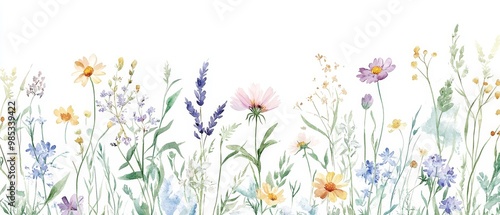 Watercolor painting of a floral border with various wildflowers on a white background.