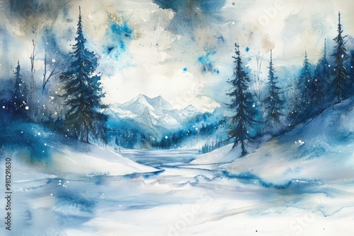 Watercolor Painting of a Snowy Mountain Landscape with a Frozen River
