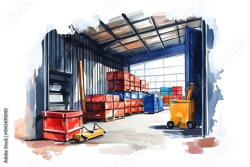 Watercolor Painting of a Warehouse Interior with Pallets of Goods and a Yellow Hand Truck.