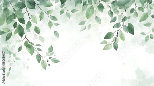 Watercolor painting of delicate green leaves on branches