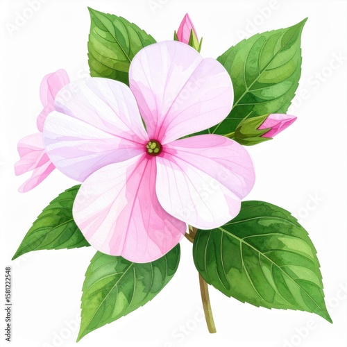 Watercolor Painting of Pink and White Blossom with Green Leaves Isolated