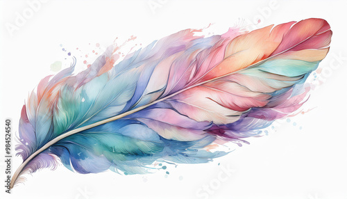 Watercolor painting of soft pastel colored feather isolated on white background. Hand drawn