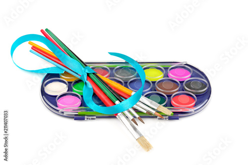 Watercolor paints and brushes isolated on white background.