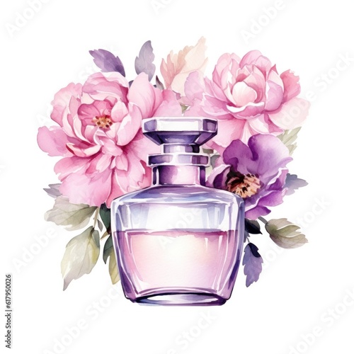 Watercolor perfume with flowers. Illustration AI Generative.