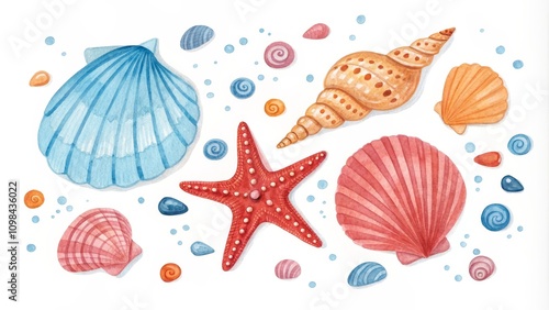 Watercolor Seashells and Starfish Ocean Dreamscape Composition