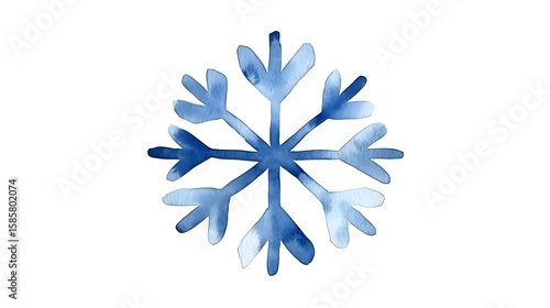 Watercolor snowflake in shades of blue with gradient effect on white background, winter holiday design element for seasonal decorations and greeting cards.