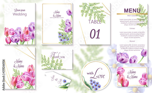 Watercolor spring wedding event invitation cards with tulip and bluebell flowers
