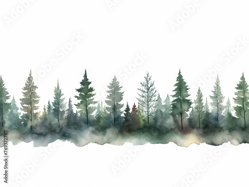Watercolor Tree Line: Rowan Tree Panorama with Dark Green and Light Gray Holiday Aesthetics Generative AI