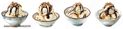 Watercolor vanilla ice cream sundaes with chocolate sauce and nuts, set of four, PNG set Transparent background
