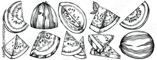Watermelon sketch vector drawing. Isolated hand drawn berry on white background. Summer berry engraved style illustration. Decoration for food packaging.