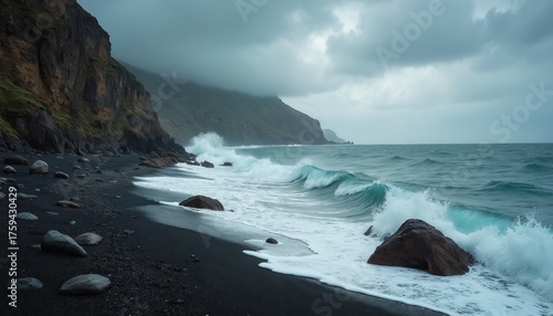 Waves crash against rocky shore on black sand beach. Cliffside with plants in background under cloudy sky. Ocean waves break on rocks near coastline. Stormy weather landscape with sea and mountains.