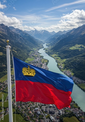 Waving Liechtenstein Flag Symbolizing Principality Pride Amidst the Alpine Majesty of the Rhine Valley