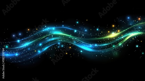 Wavy abstract light trails and sparkles on a black background. Ideal for website banners, digital art, and presentations.