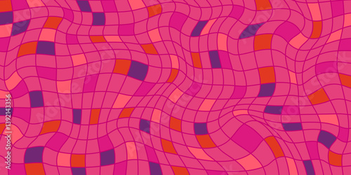Wavy Pink Checkered Pattern on Vibrant Background. Flowing retro grid with pink, orange, and purple tiles, dynamic and playful design. Perfect for retro posters, banners, web, branding