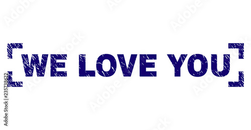 WE LOVE YOU text seal stamp with grunge texture. Text tag is placed inside corners. Blue vector rubber print of WE LOVE YOU with grunge texture.