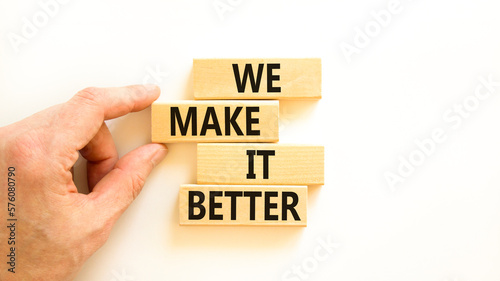 We make it better symbol. Concept words We make it better on wooden blocks. Beautiful white table white background. Businessman hand. Business we make it better concept. Copy space.