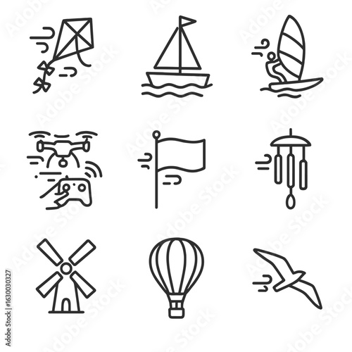 Weather and Wind Icons. Outline icon set of gust-driven activities: kite flying, sailing boat, windsurfing, drone flying, flag