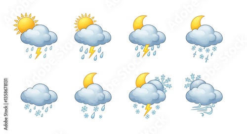Weather Forecast Icons Displaying Sun Moon Clouds Rain Snow Wind Lightning