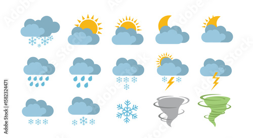 Weather icons collection featuring cloudy, sunny, windy, and stormy conditions in flat design