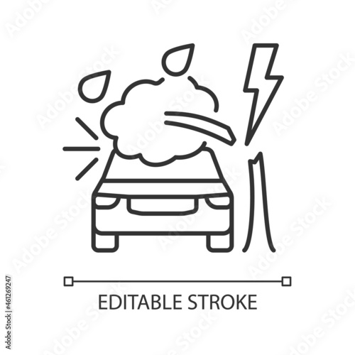 Weather related damage linear icon. Tree falling on car. Outdoor parking. Windscreen damage. Thin line customizable illustration. Contour symbol. Vector isolated outline drawing. Editable stroke