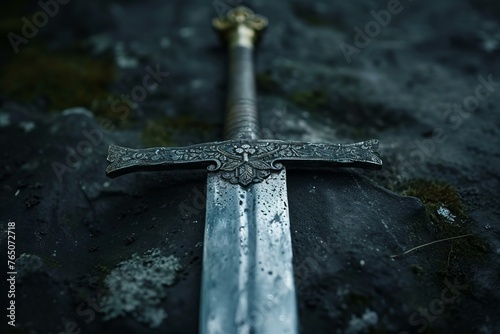 Weathered Ancient sword fantasy. Shield armor. Generate Ai