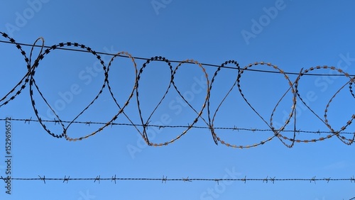 Weathered barbed wire coils creating geometric shapes, casting sharp shadows against bright azure sky, symbolizing boundary, constraint, and territorial division