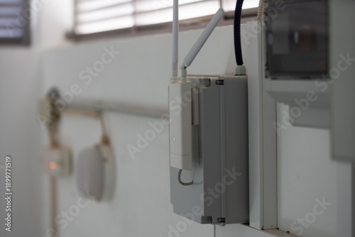 Weatherproof electrical box with cables and conduit mounted on rooftop telecom structure, industrial technology detail.