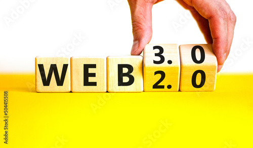 WEB 2.0 or 3.0 symbol. Businessman turns wooden cubes and changes concept words WEB 2.0 to WEB 3.0. Beautiful yellow table white background copy space. Business technology and WEB 2.0 or 3.0 concept.