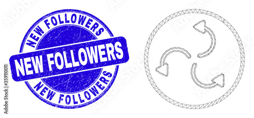 Web mesh cyclone arrows pictogram and New Followers seal. Blue vector round distress seal with New Followers phrase. Abstract carcass mesh polygonal model created from cyclone arrows icon.