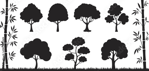 WebTree silhouette illustration, bamboo design, grass ground, forest outline, nature art, botanical sketch, landscape pattern, plant drawing, environmental graphic, foliage style