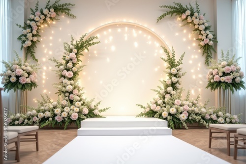 Wedding Ceremony Setup with Floral Arches and White Platform