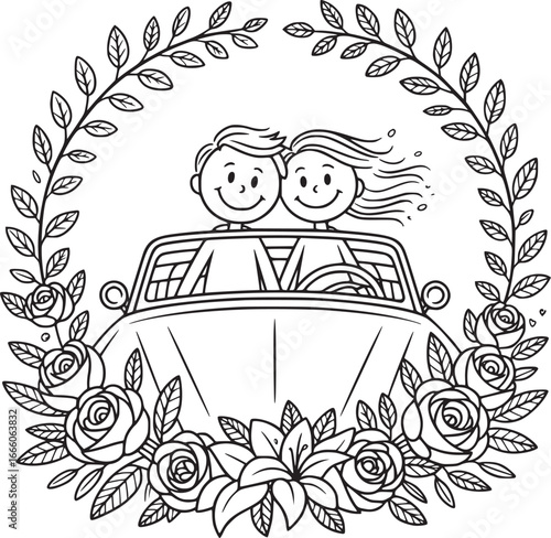 Wedding Day Car Illustration: Captivating black and white illustration features a loving couple driving in a vintage car, surrounded by a wreath of delicate flowers.