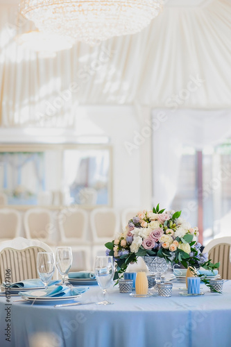 Wedding hall in the restaurant with tables decorated with cloth of blue and pink bouquet of roses and blue delphinium. glasses cutlery candles and candlesticks tablecloth