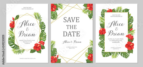 Wedding invitation set. Cards with red flowers hibiscus and tropical green leaves. Floral geometric border. Save the date, invite, birthday card design. Vector illustration.