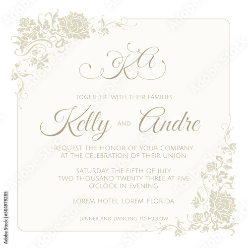 Wedding invitation with floral frame. Decorative frame with calligraphic elements. Card template for greeting card, certificate, invitation, menu.