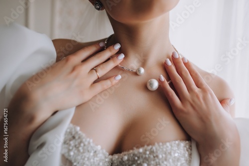 Wedding photography, portrait of the bride in a white dress with a pendant, pearls, necklace on her neck.