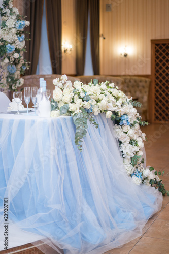 Wedding presidium in restaurant, free space. Wedding banquet table for newlyweds with flowers, greenery, pink cloth and bulbs. Lush floral arrangement on wedding table. Luxury wedding decorations